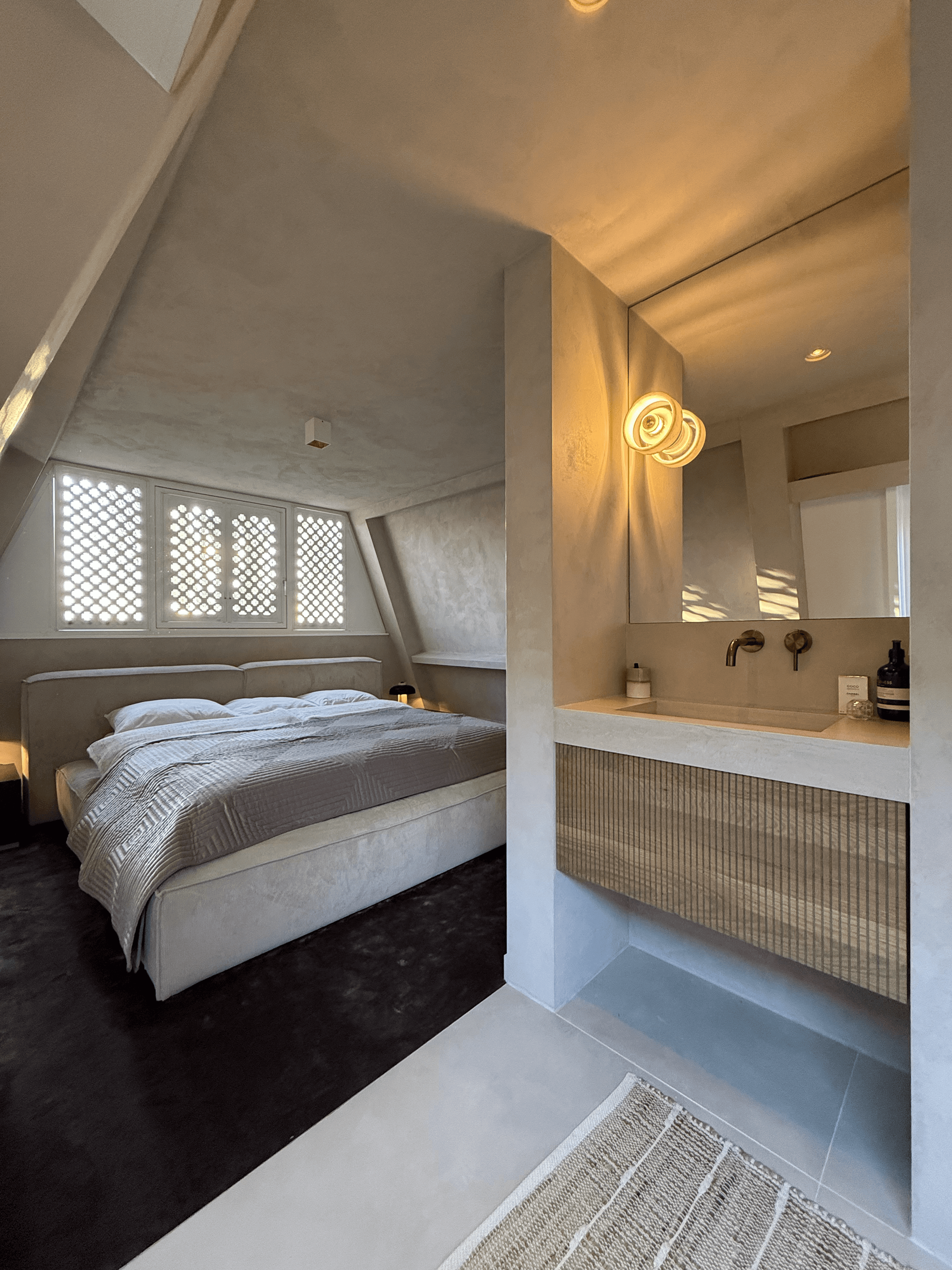 De shutters met een op maat ontworpen patroon van Abstrct geven de ruimte een symbolische en unieke uitstraling, terwijl ze tegelijkertijd bijdragen aan een aangenaam binnenklimaat door hun isolerende werking. De wanden, deuren en plafonds zijn afgewerkt met een exclusieve frescoverf van Pure & Original, wat de master ensuite een fluweelzachte, serene sfeer geeft.