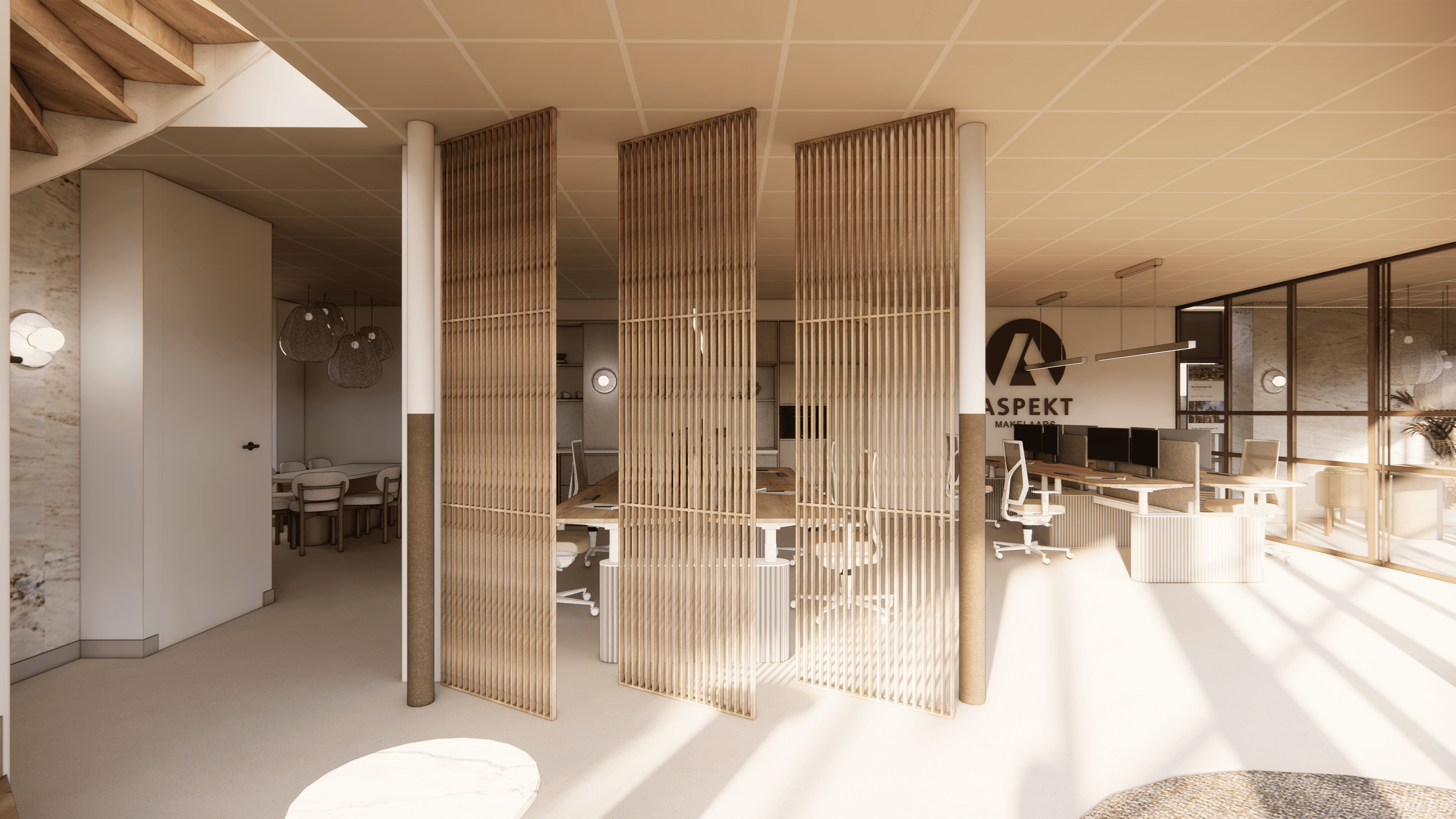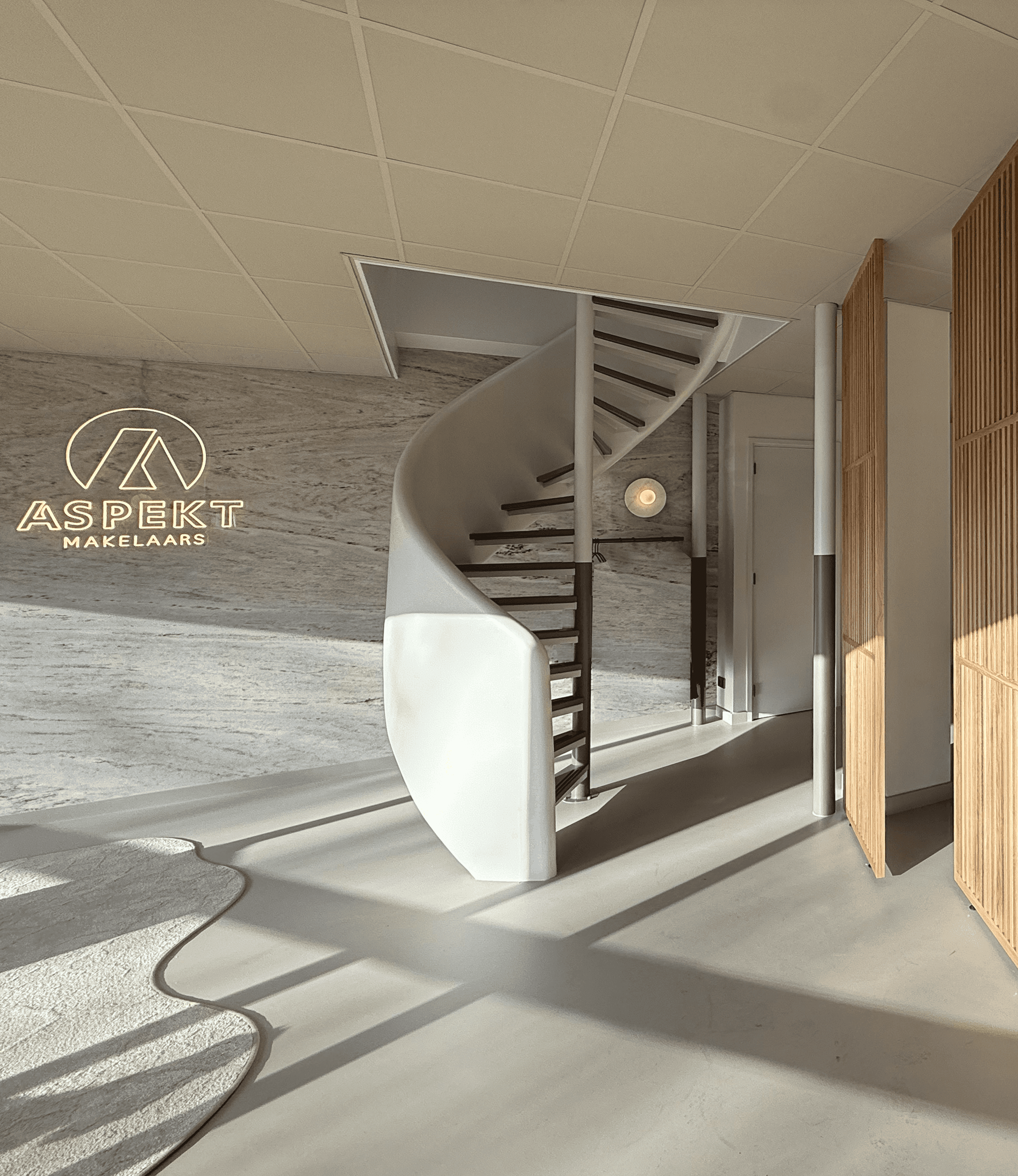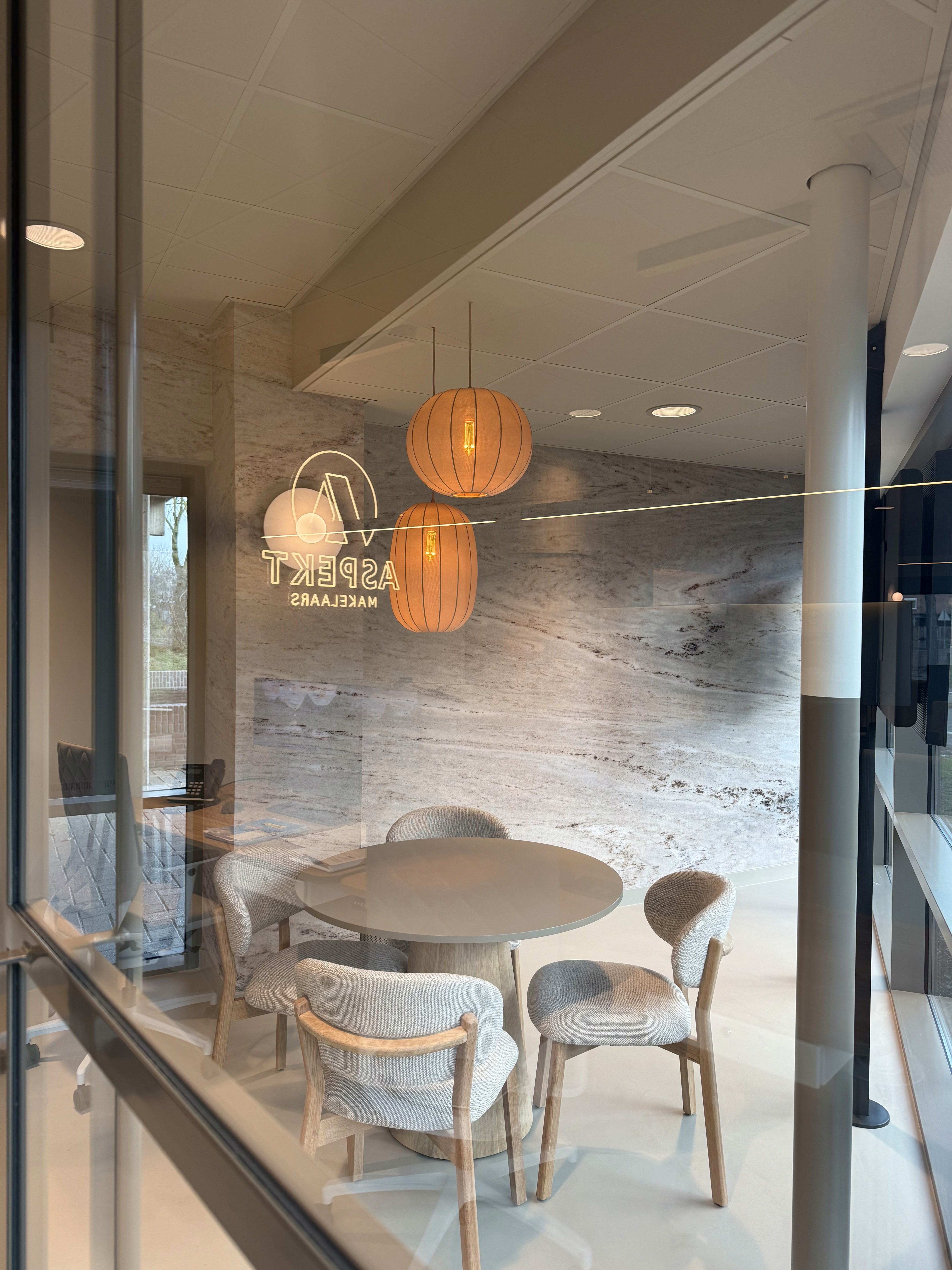 Voor een makelaarskantoor hebben we een uitnodigend kantoorontwerp gerealiseerd waarin sfeer, functionaliteit en verbinding samenkomen. De keuken en lounge vormen het hart van de ruimte, werkplekken en spreekruimtes zijn praktisch ingedeeld, en verschillende materialen en kleuren versterken de huiselijke, lichte en open uitstraling.